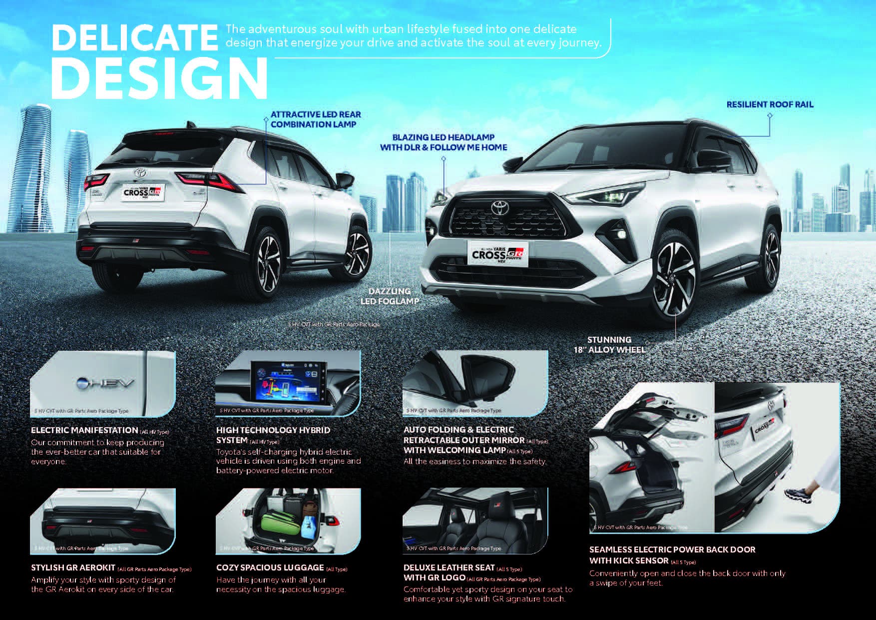 Tantang diri Anda untuk menjadi pusat perhatian, New Yaris Cross HEV hadir dengan tampilan memukau untuk menghidupkan setiap perjalanan Anda. Siapkan diri untuk perjalanan yang menggetarkan jiwa dan membangkitkan semangat. Siapkan tujuan dan capai impian Anda dengan penampilan mengagumkan.